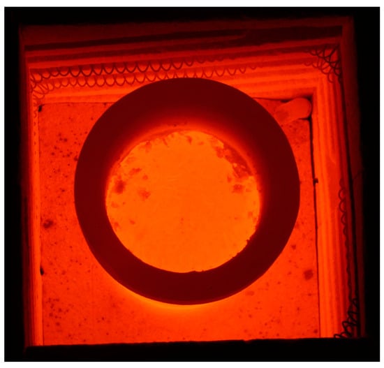 The furnace is built from JM 23 insulating firebricks [], which displayed the best thermal and mechanical properties out of available materials, with a steel shell around the brick structure. The heating coils are made from Kanthal A1 [] wire with a thickness of 0.7 mm. The coils are set in grooves carved into the bricks. In order for the furnace to be able to operate on almost any electrical network, it was decided that the maximum current in the coils would be 9 A, which corresponds to a power rating of 2.1 kW (or 6.2 kW for a three-phase configuration) at room temperature. The temperature in the furnace is regulated using a PID regulation unit, containing a REX C-100 FK07 V*AN (RKC Instrument Inc., Tokyo, Japan) temperature controller, which regulates the output power of the furnace using solid-state relays. The temperature inside the furnace is measured using a K-type thermocouple. The inside of the furnace during operation is shown in Figure 1.