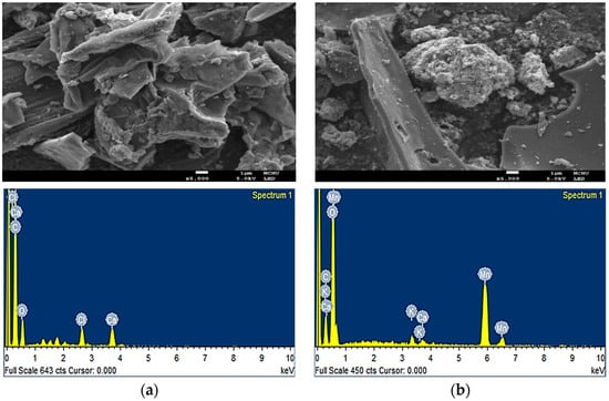 Figure 1 shows the surface image of biochar/δ-MnO2, revealing distinct spherical particles adhering to biochar. This result is similar to the findings in Ref. []. The pores of the biochar/δ-MnO2 surface are increased, consistent with the pore size analysis results (Table 1). The oxidative action of KMnO4 disrupts the micropore structure in the coating process, transforming it into mesopores. Thus, the specific surface area of biochar increased by 2.27 times after coating []. In the coating process, KMnO4 reacts with Mn(CH3COO)2·4H2O to deposit δ-MnO2 on the surface of biochar, forming a layered and flocculent structure, which provides a larger specific surface area and highly reactive void structure []. Before coating, the elements of the biochar surface included C, O, Cl, and Ca with C and O being the major elements. After thermal decomposition, peanut vines became carbon-rich solid materials, similar to the characteristics of biochar []. The presence of Cl and Ca is attributed to the use of CaCl2 as an activator in the thermal decomposition process of peanut vines. Surface elements of biochar/δ-MnO2 included C, O, Ca, Mn, and K, with C, O, and Ca having the same origins. Mn and K in biochar/δ-MnO2 originated from the precipitation reaction in coating using KMnO4 and Mn(CH3COO)2·4H2O [].
