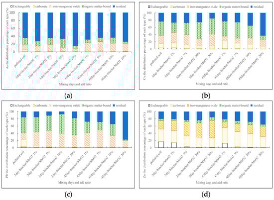 Changes form after adding different concentrations of biochar/δ-MnO2 at different times (a) As; (b) Cu; (c) Zn; (d) Pb.