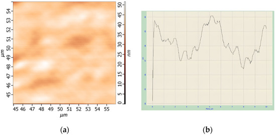 (a) AFM image (100 µm × 100 µm) of thin films based on ten layers of HgS CQDs with S2− ligand exchange; (b) AFM analysis of roughness of the thin films’ surface, based on ten layers of HgS CQDs with S2− ligand exchange.