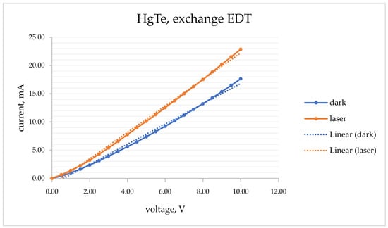 Based on the measurements of VAC, graphs of the current–voltage dependence for each electrode and different ligand substitution in both darkness and laser lighting conditions were constructed. In the case of HgTe, experiments were performed on each electrode in November 2021 and March 2022 to examine how the properties of photoresistors change with time. A photoresistor with ethanditiol-1,2 ligand exchange saved its properties in both experiments. In the cases of SCN− and S2− ligand exchange, the photoresistors’ resistance in the dark is less than with laser lightning (November experiment), and they lost their photosensitive properties by March. The iodide-substituted photoresistor did not have photosensitivity, and its resistance did not change over time. In the case of different substitutions, the current–voltage dependence functions have different forms. A classical photosensitive element (photoresistor) with linear CV function was obtained in the case of EDT ligand exchange (Figure 3). The results of AFM and VAC measurements are shown in Table 1.