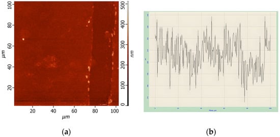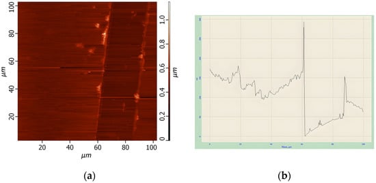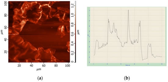 (a) AFM image (100 µm × 100 µm) of thin films based on three layers of HgS CQDs with S2− ligand exchange; (b) AFM analysis of roughness and thickness of the thin films’ surface, based on three layers of HgS CQDs with S2− ligand exchange.