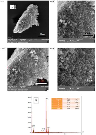 The surface morphology of the NPs and histogram of their particle size distribution are shown in Figure 5. The SEM images showed the spherical shape of the TiO2 NPs, which was particularly evident at higher magnifications. It has been suggested that excess H+ ions from H2O molecules on the surface of the TiO2 NPs could be the cause of the observed aggregation. Through van der Waals forces, these ions reduce the repulsion between the TiO2 molecules [11]. EDAX analysis was used to conduct a compositional analysis of the synthesized TiO2 NPs. As shown in Figure 5b, the NPs contained 61.51 percent by weight of Ti, 34.89 percent oxygen, 2.73 percent potassium, and 0.87 percent carbon. The presence of TiO2 NPs is confirmed by this. The presence of biomolecules in the extract of J. regia green husk is the cause of the observed C and K peaks [12]. The histogram of the particle size distribution of the TiO2 NPs is shown in Figure 5c.