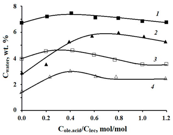 Dependence of the maximum water content in microemulsions on the ratio of molar concentrations of oleic acid and lecithin. Microemulsions contain: 1 and 3—gac oil; 2 and 4—avocado oil. The concentrations of lecithin in the organic phase of microemulsions, in wt.%, are as follows: 1,2–20; 3,4–10. T = 25 °C.