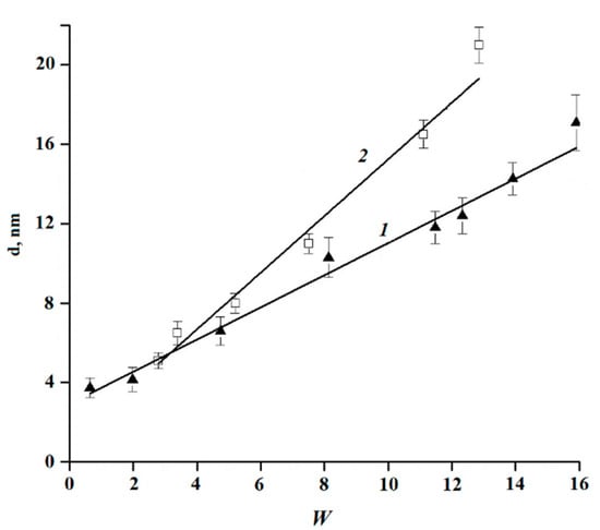 The dependence of the hydrodynamic diameter of microemulsion droplets on W; T = 25 °C. The concentrations of lecithin in the organic phase of microemulsions, in wt.%, are as follows: 1–20; 2–10. A vaseline oil and gac oil ratio of 1:1 by weight, a molar ratio of oleic acid and lecithin of 0.6, and a ratio of essential oil and lecithin of 0.225 by weight were used.