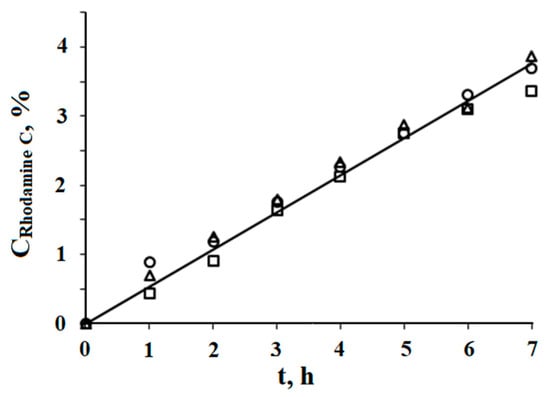 Release of Rhodamine C dye from microemulsion into saline solution (results of three parallel experiments—triangles, circles and squares respectively). The composition of the microemulsion sample, in wt.%, is as follows: lecithin—19.5; oleic acid—4.4; Vaseline oil—34.6; gac oil—34.6; turmeric oil—4.4; water—2.5. T = 37 °C.