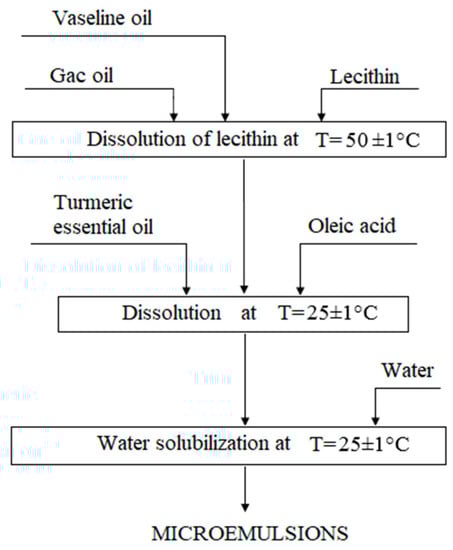 To obtain a microemulsion, a weighed portion of lecithin was dissolved in a mixture of Vaseline oil and gac oil at a temperature of 50 °C and mechanically stirred for 1–1.5 h in a closed vessel. Then, the sample was cooled to room temperature, and oleic acid and turmeric oil were added. The required amount of water was added to the resulting oil solution. Solubilization of water was carried out at a temperature of 25 °C until completely solubilized. The homogeneity of the sample and the absence of water droplets and particles of the liquid crystal phase were controlled using an Axiostar plus polarizing optical microscope (Carl Zeiss AG, Oberkochen, Germany) at room temperature.