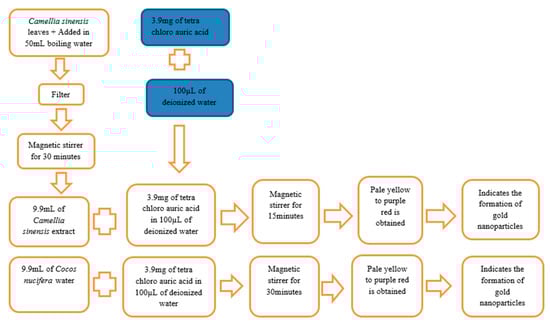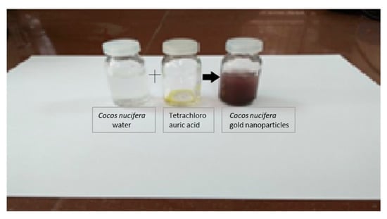 Cocos nucifera water (9.9 mL) was placed in a beaker, and 3.9 mg of tetra chloro auric acid was added in 100µL of deionized water. This solution was stirred with the help of a magnetic stirrer for 30 min. The color of this solution initially changed from pale yellow to a purple red color, and this indicated the formation of gold nanoparticles. Additionally, this solution was mixed for 20 min. The preparation of green gold nanoparticles from Camellia sinensis and Cocos nucifera is summarized in Figure 1.