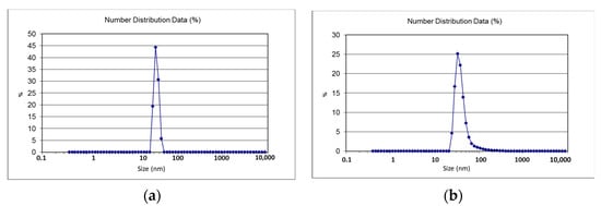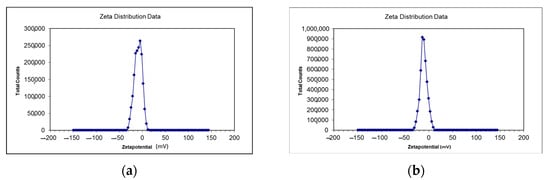 Zeta size gives an estimate of the mean size of particles and their poly dispersity index (PDI). The average zeta size of CSNp was 41.61 nm, and for CNNp, it was 34.12 nm. The zeta sizes of the nanoparticles are given in Table 1, along with the zeta scan results in Figure 4a,b. The zeta potential of CSNp was −16.52 mV, and for CNNp, it was −14.61 mV. The zeta potential values of the nanoparticles are given in Table 1, along with the zeta scan results in Figure 5a,b.