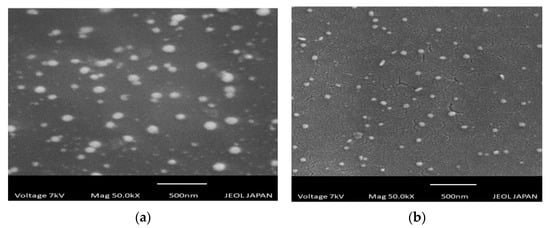 Scanning electron microscopy (SEM) presented images of the gold nanoparticles. SEM showed the morphology of the gold nanoparticles prepared from CSE and CNW had spherical shapes. SEM images are shown in Figure 7a,b.