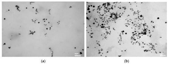 Transmission electron microscopy (TEM) was used to present images of the gold nanoparticles. TEM provided highly magnified images of the nanoparticles prepared from CSE and CNW. TEM also magnified the images up to 2 million times. The TEM images are shown in Figure 8a,b.