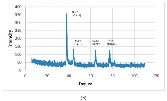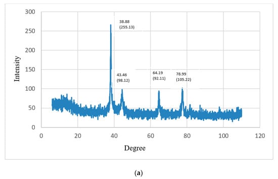 Energy-dispersive X-ray spectroscopy (XRD) was used to determine the crystallographic structure of the nanoparticles. XRD represented the crystalline nature of the gold nanoparticles prepared from CSE and CNW. The diffraction peaks of CSNp were observed at 38.17°, 44.66°, 66.13° and 76.19°, representing the intensities of (353.11), (141.1), (137.37) and (131.14). The diffraction peaks of CNNp were observed at 38.88°, 43.46°, 64.19° and 78.99°, representing the intensities of (255.13), (98.12), (92.11) and (105.22), which describe the crystalline structures of gold nanoparticles. XRD graphs are shown in Figure 9a,b.