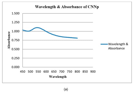 CSE and CSNp both had the same peaks, which confirmed the preparation of gold nanoparticles. CNW and CNNp both had the same peaks, which confirmed the preparation of gold nanoparticles via coconut water. These graphs are shown in Figure 6a,b.