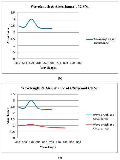 UV-Visible spectroscopy was used to determine the absorbance of gold nanoparticles. The maximum (λmax) of the localized surface plasmon resonance (LSPR) absorption band occurred in the range of 520–570 nm for gold nanoparticles. The λmax of CSNp was 540 nm, and for CNNp, it was 524 nm. These conclusions are related to the conclusions in [].