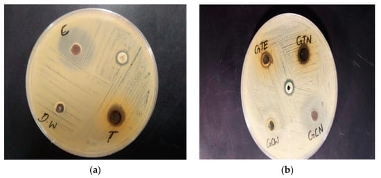 (a) Zones of inhibition of CSNp and CNNp against Staphylococcus aureus; (b) zones of inhibition of CSE, CNW, CSNp and CNNp against Staphylococcus aureus. C: Green coconut (Cocos nucifera) gold nanoparticles; T: green tea (Camellia sinensis) gold nanoparticles; Amp: ampicillin (antibiotic); DW: distilled water; GTE: green tea (Camellia sinensis) extract; GTN: green tea (Camellia sinensis) gold nanoparticles; GCW: green coconut (Cocos nucifera) water; GCN: green coconut (Cocos nucifera) gold nanoparticles.