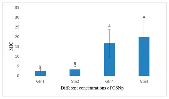 Graphical representation of mean MICs of different concentrations of CSNp against S. aureus for 24 h incubation. Means that do not share A letter are significantly different.