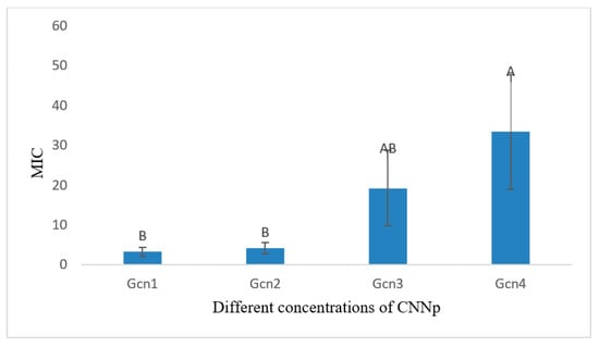 Graphical representation of mean MICs of different concentrations of CNNp against S. aureus for 24 h of incubation. Means that do not share A letter are significantly different.