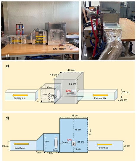 Photographs (a,b) and schematic drawings (c,d) of a custom air handling unit and ductwork serving the chamber in recirculation mode, with the ionizing/oxidizing electronic air cleaner (EAC) installed in a plenum, used for experimental in Chicago, IL, USA.