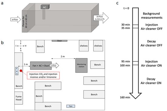 The controlled laboratory experiments followed a timeline shown in Figure 3c, beginning with a period of background measurements in the unoccupied laboratory, followed by injection of a challenge constituent or constituents. Background measurements occurred following a long period of no occupancy and no activity in the lab. A decay period followed pollutant injection. During the first injection and decay, the air cleaner was switched off. Then the process was repeated with the air cleaner turned on. We conducted three injection and decay tests: (1) incense burning only, with the primary aim to elevate particle concentrations and measure their decay; (2) limonene injection only, to measure gas-phase removal effectiveness of the air cleaner; and (3) incense burning and limonene injection combined to evaluate the removal effectiveness for both types of constituents. These test conditions were contrived to evaluate if an increasing air pollution load and complexity influenced the removal rate of VOCs and/or particles.