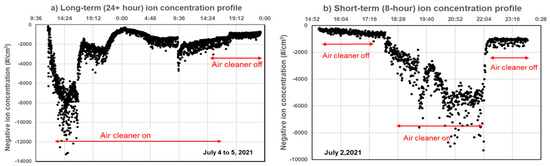 Example negative ion concentration profiles over time for (a) long-term (24+ h operation) test followed during ‘natural’ conditions (i.e., no pollutant injection) and (b) short-term (4-h operation) test during ‘natural’ conditions (i.e., no pollutant injection).