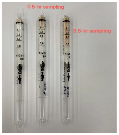 During the single H2O2 production potential test, the Dräger-Tube was inspected after 0.5 h of sampling and some brown coloration was observed, extending to ~0.1 ppm on the tube (Figure 5). The tube was then re-inserted and continued to sample until 3.5 h elapsed, at which point the brown coloration was observed to be extended to ~2.5–3.0 ppm on the tube. Here we use 2.5 ppm as a conservative estimate of the resulting reading. At 0.5 and 3.5 h of sampling time at a sample flow rate of 660 mL/min, a total sample volume of ~19.8 L and ~138.6 L was collected, respectively, representing ~10x and ~69x more sample volume than a 3-min 100 mL/pump hand pump approach would have collected. Thus, these sample volume ratios were used to dilute the concentration readings from each sample, resulting in an estimated equivalent of ~0.01 ppm (~10 ppb) and ~0.036 ppm (~36 ppb) for the 0.5-h and 3.5-h sample times, respectively. These estimated molar concentrations were then converted to mass concentrations assuming a MW of H2O2 of 34 g/mol, yielding ~14 and ~51 µg/m3, respectively. Finally, these concentration estimates were converted to estimates of H2O2 generation rates by multiplying the resultant concentration by the recirculating airflow rate in the air handler (343 m3/h). This approach resulted in estimates of H2O2 generation rates of ~5 mg/h at the 0.5-h sample and ~17 mg/h at the 3.5-h sample. While these approximations are at best semi-quantitative and rely on a number of assumptions such as linear scaling of the visual concentration reading to collected sample volume, they suggest that (i) there was indeed H2O2 production during EAC operation and (ii) the magnitude of H2O2 production may be on the order of mg/h from this EAC operating in this test chamber configuration.