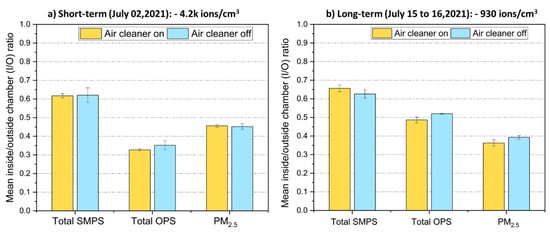 Mean (SD) inside/outside (I/O) chamber concentration ratios measured for three particle metrics (total SMPS number, total OPS number, and estimated PM2.5 mass concentrations) during two natural condition tests: (a) short-term (2 July 2021) and (b) long-term (15–16 July 2021).