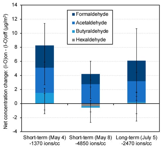 To illustrate the observed net changes in aldehydes and their associated propagated uncertainties, Figure 8 shows the net production or removal of gas-phase organics measured during air cleaner on and off conditions for compounds on the TO-11A analyte list that were detected above reporting limits (RLs) in samples collected during the three natural condition tests. Positive values represent net production and negative values represent net removal; error bars show propagated uncertainties. There was a relatively consistent net increase in the sum of quantified compounds on this list of approximately +5–6 µg/m3 during all three tests, albeit within propagated uncertainty for two of the three tests and just outside uncertainty for the other test. Multiplying the net change in total aldehyde concentrations by the chamber volume and air change rate during each test yields a rough approximation of the total aldehyde generation rate (and estimated propagated uncertainty) during air cleaner operation of ~430 (490) µg/h, ~390 (280) µg/h, and ~420 (630) µg/h during the 4 May, 8 May, and 5 July tests, respectively. While the estimated total aldehyde generation rate across these three tests is relatively consistent (~390–430 µg/h), the high propagated uncertainty in this measure crosses 0 µg/h in two of the three tests. Despite the high uncertainty, the apparent net production of low molecular weight aldehydes (e.g., acetaldehyde) is reasonably plausible given our understanding of the potential impacts of ionization and oxidation chemistry resulting from additive EAC operation. However, further work should strive to reduce uncertainty in such estimates.