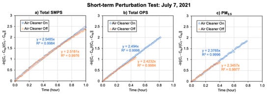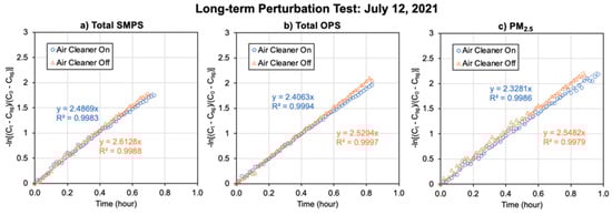 Figure 9 and Figure 10 show results from one short-term and one long-term perturbation test targeting particles via injection and decay of incense. We aimed to have at least one natural logarithm removal from initial particle concentrations to use for the linear regressions to solve for loss rates (via Equation (2)). This resulted in between about 25 and 60 min of decay per test. Only data from the first ~25 min were used for the regressions with total OPS and PM2.5 concentrations from the short-term perturbation test with the air cleaner off because the regression became sub-linear after that, most likely due to transient changes in the ambient lab air concentration that were not measured. Regression results are also summarized in Table 4, along with estimates of clean air delivery rates (CADR) made using Equation (3) and single-pass particle removal efficiencies made using Equation (4). Uncertainties in CADRs are estimated using the standard errors from regression coefficients added in quadrature with the square of the chamber volume. Uncertainties in removal efficiencies are estimated by adding the standard errors from regression coefficients in quadrature with the uncertainty in the DuctBlaster air flow rate measurement (3%) []. It is worth noting that both estimates of uncertainty are most likely underestimated because there are other non-quantifiable sources of uncertainty such as the uncertainty in the selection of the background concentration inside the chamber.