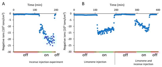 Figure 11 shows time-series concentrations of negative ions measured at the monitoring station during injection and decay tests in the controlled laboratory study. There existed a strong spatial gradient of ions in the laboratory environment, despite the presence of substantial mixing airflow provided by the three recirculating fans in the space. During brief spatial mapping of the ion concentration in the laboratory in a preliminary experiment where the air cleaner was on and no challenge compounds were injected, we observed negative ion concentrations exiting the duct of ~3 × 106 ions/cm3, ~2.5 × 104 ions/cm3 at the monitoring station, and ~8 × 103 ions/cm3 at the northwest and northeast corners of the laboratory. During experiments where challenge pollutants were injected, we located the ion monitor at the monitoring station identified in Figure 3 throughout the experiments. Shown in Figure 11 is that negative ion concentrations are substantially elevated during all periods of air cleaning operation compared to background periods, though the trend and range of values differed across the three experiments. The air exchange rate was stable across the two days of experiments (Table 4), as were materials and activities in the laboratory. We speculate that differences in negative ion concentration across the three experiments reflect the differing challenge mixtures across the experiments. For example, it is consistent that the experiment with the highest mass loading of challenge pollutants (limonene and incense simultaneously) had the lowest measured ion concentration as there existed more reaction sites for ions and products of ion chemistry to interact with.