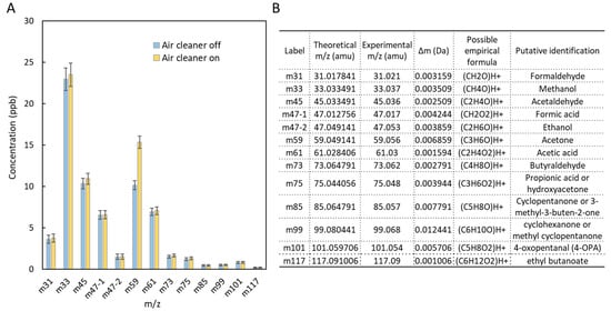 Shown in Figure 13A are time-averaged concentrations of potential limonene oxidation products measured during the limonene only injection and decay experiment. From the reaction between limonene and oxidants such as O3 or OH radicals, a variety of carbonyl compounds, including ketones, carboxylic acids, and aldehydes may be formed [,,]. Since the purported mechanism of the air cleaner studied in this work is the generation of oxidant species (H2O2) and positive and negative ions that may subsequently lead to generation of oxidants (e.g., radicals), we report in Figure 13A possible VOC reaction products from oxidation of limonene. We time-average the concentrations of the reported species over periods of measurement with the air cleaner off and with the air cleaner on; note that corresponding timeseries are reported in Figure A2 in Appendix A. Shown in Figure 13B is the putative identification of each compound based on the measured experimental m/z, assignment of chemical formula, and plausible associated chemical. Note that compound identification in PTR-TOF-MS based on exact mass is subject to uncertainty.