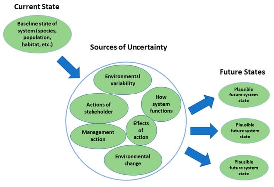Conceptual diagram illustrating some of the ways uncertainty can come into projections of future system states for ecological systems. There may be initial uncertainty about the current state of a system for many wildlife managers, which may be further complicated by additional uncertainty about management or societal actions and interacting processes, as well as uncertainty about the context and function of multiple plausible future states.