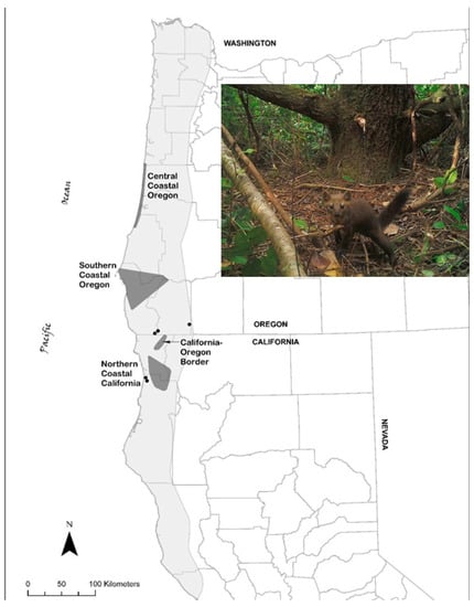 Historical range of the coastal marten indicated by light grey, with the 4 currently extant populations delineated by darker polygons. Black circles indicate single detections that do not constitute a population. Fires have been an important historical disturbance throughout the species’ range, as fire creates structural features (e.g., snags, hollow trees, resting platforms, down logs) conducive to suitable habitat. Major fires have traditionally been infrequent [], however, and more severe fires may eliminate structural features and increase the abundance of predators or competitors, resulting in degraded marten habitat [,]. Warmer and drier conditions are projected for this coastal region [,], which may lead to more frequent large fires and reduced habitat suitability. Future scenarios incorporated levels of altered fire cycles along with other disturbance regimes influenced by climate change. Map from []; photo by U.S. Forest Pacific Northwest Research Station and Oregon State University.