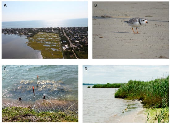 Unless action is taken, the NWRS will continue to lose important coastal habitats, and the species that depend on them such as the recently listed Eastern Black Rail (Laterallus jamaicensis jamaicensis). This secretive marsh bird relies on high quality marsh habitat, and primary factors for its listing include “habitat loss and destruction, sea level rise and tidal flooding, incompatible land management, and increasing storm intensity and frequency” []. Many of the Atlantic coastal NWRs are dominated by marsh habitat, with potential use by the rail. These habitats also provide human co-benefits (Figure 3A) such as storm attenuation by absorbing the energy from these events []. However, if a marsh is sediment starved (i.e., cut off from the sediment source by a road or housing development) as sea level rises, the stress of frequent inundation can weaken vegetation to the point that it succumbs and dies []. When this occurs, erosion rapidly transforms a marsh into a mud flat and eventually open water []. Not only does wildlife lose habitat (Figure 3B), but the provided ecosystem services are also lost.