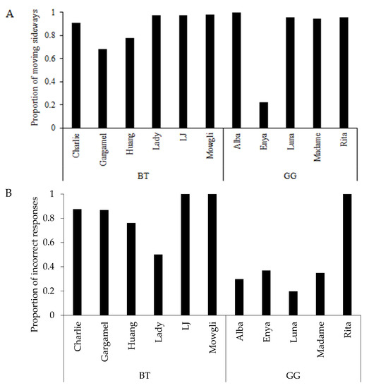 Most macaws did not reach the criterion for pattern A, and so we analysed their search order to examine why they may have failed to do so. During a trial, the macaws frequently chose an adjacent well after making a choice (e.g., 1 → 2, 2 → 6 Figure 4). Their movement to an adjacent well could be categorised as two types: forward (e.g., 2 → 6) or sideways (e.g., 1 → 2) (Figure 4). However, sideways movements would not facilitate the macaws to reach the criterion of pattern A. We focused on the unsuccessful individuals’ initial two choices of each trial, which determined whether they would reach ρ ≥ 0.8 for that trial. Indeed, all the BT and 4 GG (except Enya) mostly showed sideways movement (median: BT: 94.3%, GG: 95.6%) (Figure 10A). Regardless of the outcome (correct or incorrect) of the first response, moving sideways to an (incorrect) adjacent well (e.g., 1 → 2, Figure 4) was predominant in all the BT (median: 87.1%) and one GG (Rita, 100%) (Figure 10B).