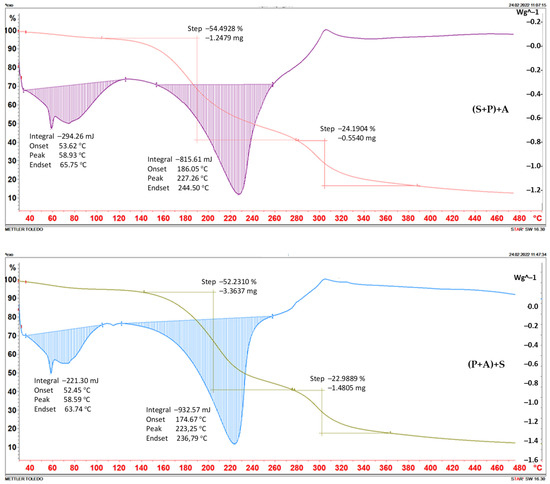 Decomposition of foils proceeded in two steps In the first step, (P+A)+S, (P+S)A, and (S+A)+P foils lost over 50% of their original weight, (P+A+S), (P+A)+O, and (P+O)+A foils lost 47 to 48% of their initial weight, and (O+A)+P and (P+O+A) foils lost hardly 38.5 and 30% of their weights, respectively. These differences had no relation to the water content of those foils, thus they depended on the structure of matrices in which weak intermolecular was preferred. The second step decomposition of foils took place between 220 and 280 °C. The (P+O+A) foil decomposed at 220 °C and lost 40% of its weight (Figure 1 and Figure 2).