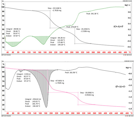Clearly, the thermal stability of the foils depended on the method of their preparation. The (P+O)+A and (P+A)+S foils were the most temperature resistant. Likely, the interactions of P with O and P with A in binary systems were relatively weak, and the admixing of the third partner considerably changed the macrostructure of those complexes.