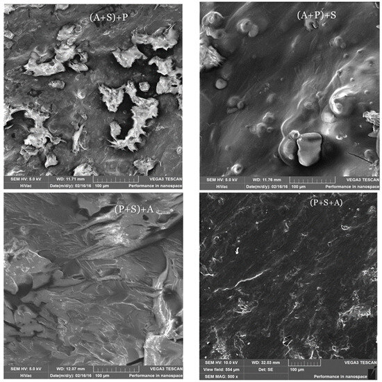 Scanning Electron Microscopy (SEM) showed that independently of the composition and sequence of blending their components, every foil contained two fractions, although their proportions varied from one foil to another (Figure 3). Generally, foils prepared with O were more uniform because the proportion of the first low-temperature fraction was lower than that in the foils with A. Based on that criterion, among O-A-P foils, (O+A+P) and (P+A+O were the most uniform. For the same reason, among P-A-S foils, the (S+A)+P foil offers the highest uniformity. A comparison of these results with the results presented in Table 1 showing the functional properties of those foils revealed that the functional properties not only depended on their uniformity but also on non-covalent intermolecular interactions in the major fraction of the foils.