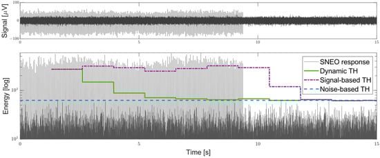 - A novel dynamic threshold per-channel estimation based on the Root Mean Square (RMS) of the SNEO output that accommodates any drift of the probe or changes in the signal quality, that rapidly converges to a firing-independent value close to an ideal threshold based only on the noise energy. The threshold can be adjusted by the user, to open the detection of both the single AP and MUA.