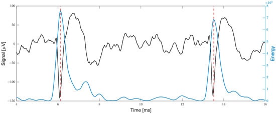 For each new sample, the SNEO output is computed and compared with the two previous samples searching for a local maximum, and with the threshold found in the previous RMS timeframe (Equation (3)). It must be considered that a peak in the SNEO output can be not precisely aligned with the peak in the filtered signal. In fact, depending also on the filtering [], the positive rebound following the negative spike peak can reach a prominent amplitude in the transition from the negative and the positive phase of the spike, developing enough energy to shift the SNEO output peak (Figure 4). Therefore, if the output is a local maximum and is also greater than the threshold, the algorithm searches for the minimum value among the previous samples of the filtered signal, within a window wide as the Bartlett window, which is used to smooth the SNEO. Once the minimum is found, the index will represent the spike temporal information, while the value will be the spike amplitude (Equation (4)).
