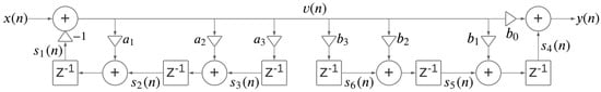 Direct and direct-transposed from I and II have been simulated for the FPGA integer-based implementation of the third order IIR filter. Using the direct-transposed form I (Figure 7), the state variables of the filter did not saturate, and the filter remained stable despite the rounding error on the output, avoiding using a cascade of second order filters. Being the coefficients real numbers close to the 0 value, the error introduced by the rounding would be disastrous. To overcome this problem working in the integer domain, the coefficients are scaled by a factor big enough to reduce the rounding error to a negligible one. This scaling factor is chosen as a power of 2, to be then removed from the filter output with a bit-shift operation. The filter form fits well to the DSP48A1 multiplier/adder of the Spartan-6, that provides a signed multiplication of 18-bit per operand, followed by a 48-bit adder. Two DSPs are used to create a 35 × 18-bit fully pipelined multiplier with a 48-bit adder after the multiplication stage. The six filter state variables of the 32 channels are stored in a 48-bit width BRAM, where the state variables of each channel are mapped. A scaling factor of  is chosen to scale the filter coefficients to fit the 18-bit signed input of the multiplier being sure to not exceed the  limit. In Table 2, the integer coefficients are shown with the percentage rounding error. For each new sample to filter, the sum of the 16-bit value of the new sample with the state  is tied in the input on the 35-bit multiplicand port. This value is reduced by the scaling factor and is resized to 35 bits without losing any information. The filter coefficients are given sequentially on the 18-bit multiplier port and the corresponding channel state variable is given on the 48-bit sum port to compute all the new state values. The filter output, reduced by the scaling factor, can be safely resized to 16 bits. Even if it is smaller on average compared to the input, the output bit width is kept the same since an eventual stimulation artifact can cause the signal to span on the entire range even after the filtering.