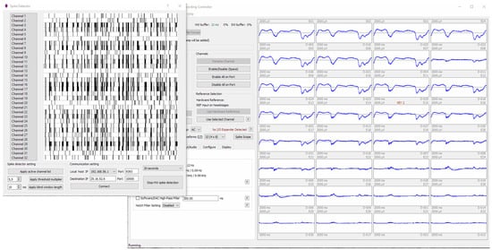 The open-source software of the RhythmStim for the host computer has been modified (with Qt 5.15.1) to support the new features introduced in the acquisition system. By default, the software manages the data transfer from the acquisition system to the computer thanks to the USB communication provided by the PipeOut construct, of the Opal Kelly board and manages the transfer of data via USB. On the HDL side, the PipeOut is instantiated on a specific endpoint, an address, and it is interfaced with the read-side of a 16-bit width FIFO. At this point, the data contained in the FIFO can be retrieved with an API call on the host side, specifying the endpoint and the length of the transfer in bytes. A PipeOut is instantiated in the RhythmStim design connected to the Opal Kelly RAM to manage and buffer the recording transfer. A second PipeOut has been added to bypass the RAM buffering and to provide the spikes information with a lower latency. While the first PipeOut continues to stream the buffered data in big chunks, the software runs a secondary thread polling the new PipeOut for new data every millisecond. The FIFO connected to the PipeOut provides to the software the count of words that it contains. Whenever the software notices that this count is greater than 0, it reads from the PipeOut all the spikes contained in the FIFO. The words counter is given to the host by the WireOut construct of the Opal Kelly, that thanks to an endpoint exposes FPGA variables of 32 bits via USB through an API. The spikes acquired by the software can be streamed via the UDP protocol to any user-defined IP address. The packet is formed by four integers of 4 bytes in Big-Endian order which are, ordered in an array position from 0 to 3: Zero, timestamp, amplitude, and channel. If the acquisition system is saving data on the disk, the detected spikes are also stored in a file separated from the main record. Thanks to the WireIn constructs, used to show variables from the software to the FPGA, the user can control the digital SD through the software to run or stop it, to set the threshold multiplier (in 0.5 step), the blind window length (to stop the detection for a few ms after a stimulation command), and the channels whose outputs have to be active. These parameters are exposed to the user with a dedicated application window reachable from the main window of the RhythmStim application, also showing a real time raster plot of the spiking activity (Figure 8).