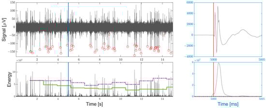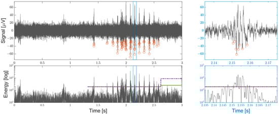 Multi Unit Activities (MUAs) on 3 s of acquisition. Top: Activity recorded by an electrode without any clear source of APs near the surface. The MUAs oscillations detected are circled in red and provide a firing profile of the neuronal population. On the right, the detection of the highlighted single MUA is magnified. Bottom: The energy output from the SNEO operator (in gray, reported in a logarithmic scale), is compared with the dynamic threshold in solid black to detect the oscillations. The threshold based on the RMS of the entire signal is reported with the dashed line for comparison. On the right, the energy response of the highlighted MUA is shown.