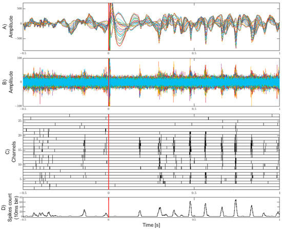 ICMS evoked response in a 1.5 s window. The red bar at time 0 corresponds to a cathodic to anodic ICMS of ±50 µA of 200 µs per phase injected by the fifteenth channel every 10 s. A: LFP evoked response enhanced by band-pass filtering the signal between 5 and 200 Hz. B: Spiking activity enhanced by high-pass filtering the signal with a cutoff frequency of 300 Hz. C: Raster plot of MUA detection on data recorded by the linear probe. Channel 1 is the deepest in the barrel cortex, channels 28 to 32 are excluded being outside the cortex. The electrode of channel 8 has a high impedance and is not recorded properly. Before the stimulation, a random firing pattern can be observed from −400 to −300 ms and a spontaneous synchronous activation at −140 ms. After the stimulation, a synchronous activation of a neuronal population is observed spreading across the different channels. D: Cumulative spiking activity (instantaneous firing rate) of the channels in a moving sum window of 10 ms.