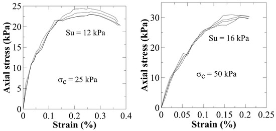 As for the specimens obtained under different preconsolidation stresses, Figure 17 shows the plots of the unconfined compression results for reconstituted block specimens at preconsolidation stresses under the same conditions as the built specimens where the VSTs were executed. The undrained strength averaged for the specimens with preconsolidation stresses of 25, 50, and 100 kN/m2 yielded Su values of 12, 16, and 22 kN/m2, respectively.
