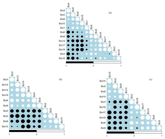 In the current study, climatic data were obtained from the WorldClim database (www.worldclim.org/current; accessed on 18 February 2022) []. These climatic variables were generated by interpolating the average altitude, temperature, and rainfall data between 1950 to 2000 []. The downloaded data had a resolution of 30 s (approximately 1 km2). The current study utilised 19 bioclimatic variables from the WorldClim database (Table 2). These bioclimatic variables are frequently used in investigating species distribution [,,].