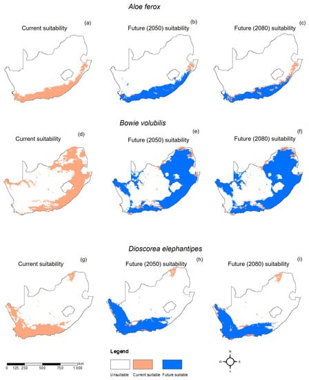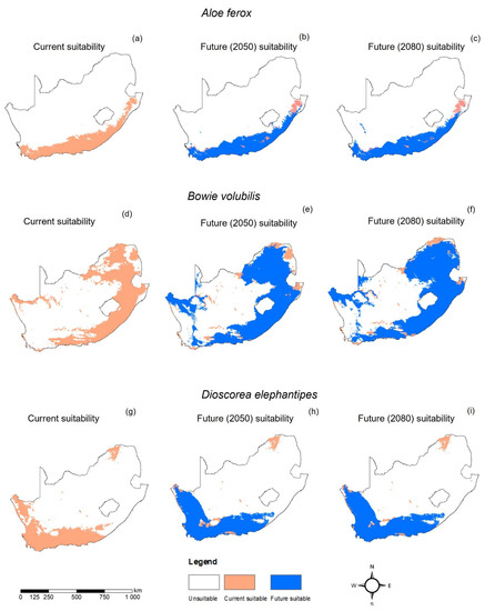 Climate change has been predicted to affect the geographic distribution of global plants. Predicting the effect of climate change on species’ habitats gives guidance on the expected future spatial distribution changes []. The current study highlighted some geographical shifts of habitats for important medicinal plants in South Africa.