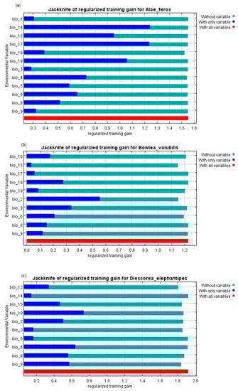 Relative predictive power of bioclimatic variables in South Africa based on the jackknife of regularised training gain in the maximum entropy (MaxEnt) models for (a) Aloe ferox, (b) Bowiea volubilis, and (c) Dioscorea elephantipes.