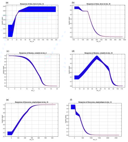 Species response curves indicating the relationships among the bioclimatic variables and (a,b) Aloe ferox, (c,d) Bowiea volubilis, and (e,f) Dioscorea elephantipes in South Africa. The red lines indicate the mean of 10 replicates of the maximum entropy (MaxEnt) runs, and the blue lines represent +/− one standard deviation.