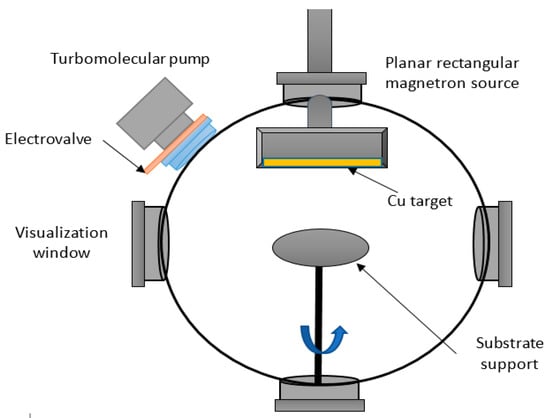 The copper coating onto the textile fabrics was performed at INFLPR into a dedicated stainless steel spherical vacuum chamber (K.J. Lesker, East Sussex, UK), pumped out by an assembly of a fore pump and turbomolecular pump (Pfeiffer, Memmingen, Germany), which allowed the obtaining of a base pressure down to 3 × 10−5 mbar. A constant argon flow (purity 6.0) of 50 sccm was continuously introduced into the chamber by means of a Bronkhorst mass flow controller, which allowed to establish the processing pressure around 5 × 10−3 mbar. The chamber is provisioned with a rectangular magnetron sputtering gun from K.J. Lesker, accommodating the high purity copper target. The discharge was ignited by means of a radio frequency generator (13.56 MHz) provisioned with an automatic matching box for adapting the impedance, and the deposition time was set to ensure coating thicknesses in the range 1200–10,000 nm on each side of the textile fabrics. Enhanced deposition uniformity was achieved by rotating the samples during the deposition process (200 rotations/min).
