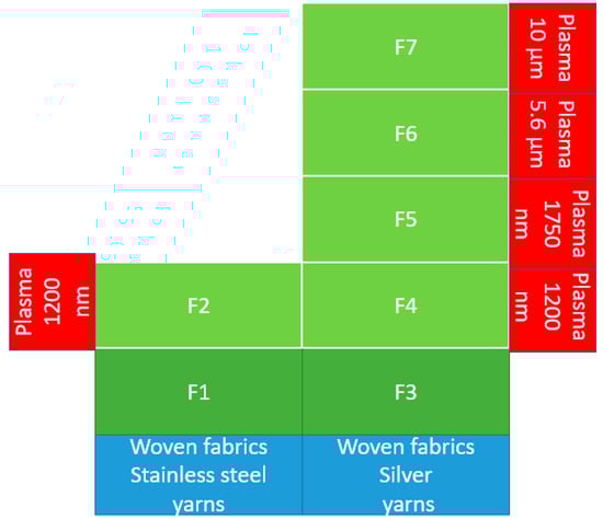 Figure 1 presents a sketch of the experimental set-up of the magnetron plasma equipment of INFLPR. Sample F2 resulted by plasma coating of F1 (stainless steel yarns) on both sides with 1200 nm of Copper, while samples F4, F5, F6 and F7 resulted by coating F3 (silver yarns) on both sides with 1200 nm, 1750 nm, 5600 nm and 10,000 nm of copper, respectively. More details regarding the experimental plan considered for the validation of the model is summarized in Figure 2.